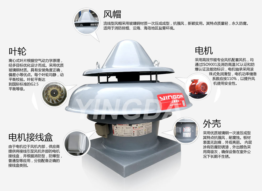 1.1.DWT-II型玻璃鋼離心式屋頂風(fēng)機(jī),其葉輪采用離心式葉輪,可適用風(fēng)量小而壓力較高的場所;采用單層風(fēng)帽。
