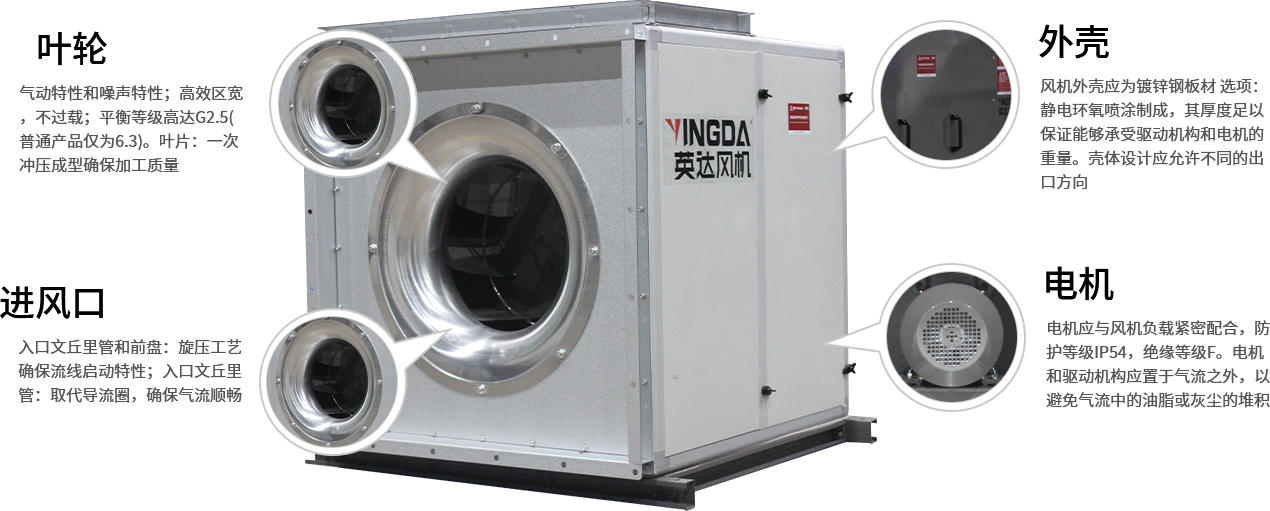 電機(jī)應(yīng)與風(fēng)機(jī)負(fù)載緊密配合,防護(hù)等級(jí)IP54,絕緣等級(jí)F。電機(jī)和驅(qū)動(dòng)機(jī)構(gòu)應(yīng)置于氣流之外,以避免氣流中的油脂或灰塵的堆積。
