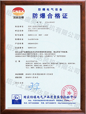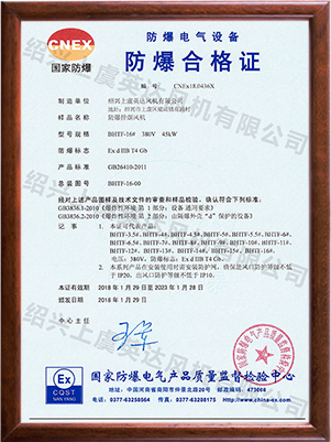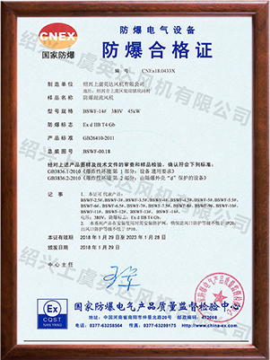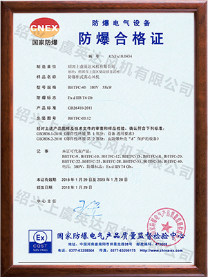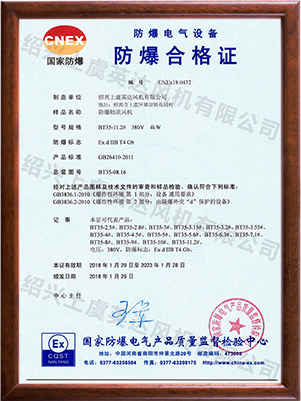 為適應(yīng)防爆環(huán)境需要,風機可做成防爆風機,防爆等級為EXdⅡBT4,適用于易燃、易爆氣體的場所。整機通過國家防爆認證。